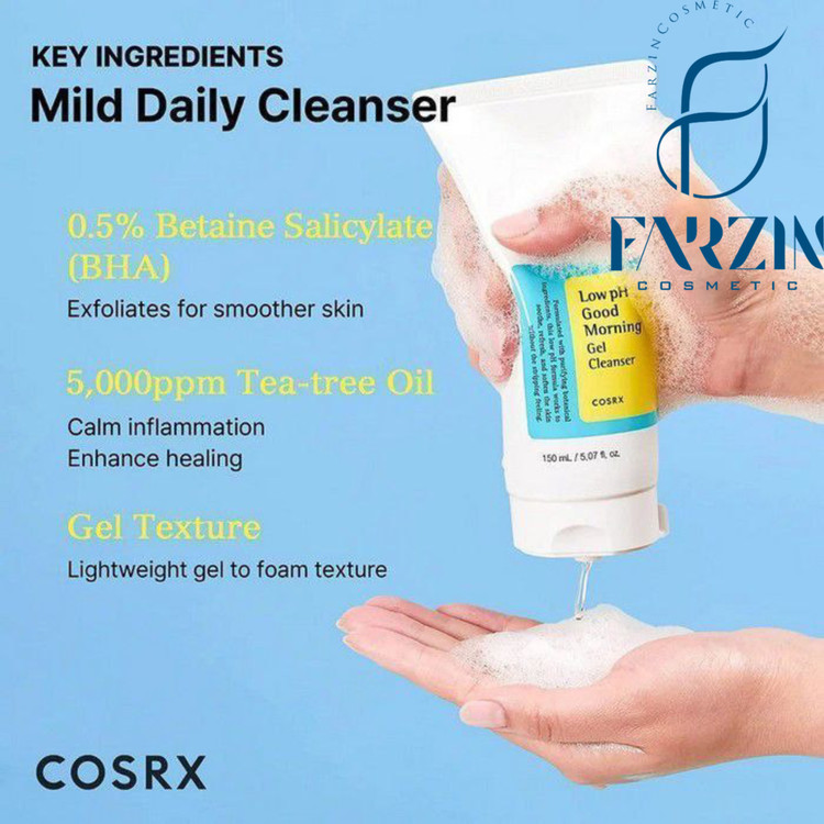 ژل شوینده گود مورنینگ کوزارکس با pH پایین | 150 میل یک شوینده ملایم و بسیار موثر از نوع ژلی برای پوست صورت است. این محصول با ترکیبات موثری مانند بتاهیدروکسی اسید طبیعی (BHA) و روغن درخت چای فرموله شده و تمامی آلودگی ها و ناخالصی ها و سلول های مرده را به آرامی از بین می برد.
